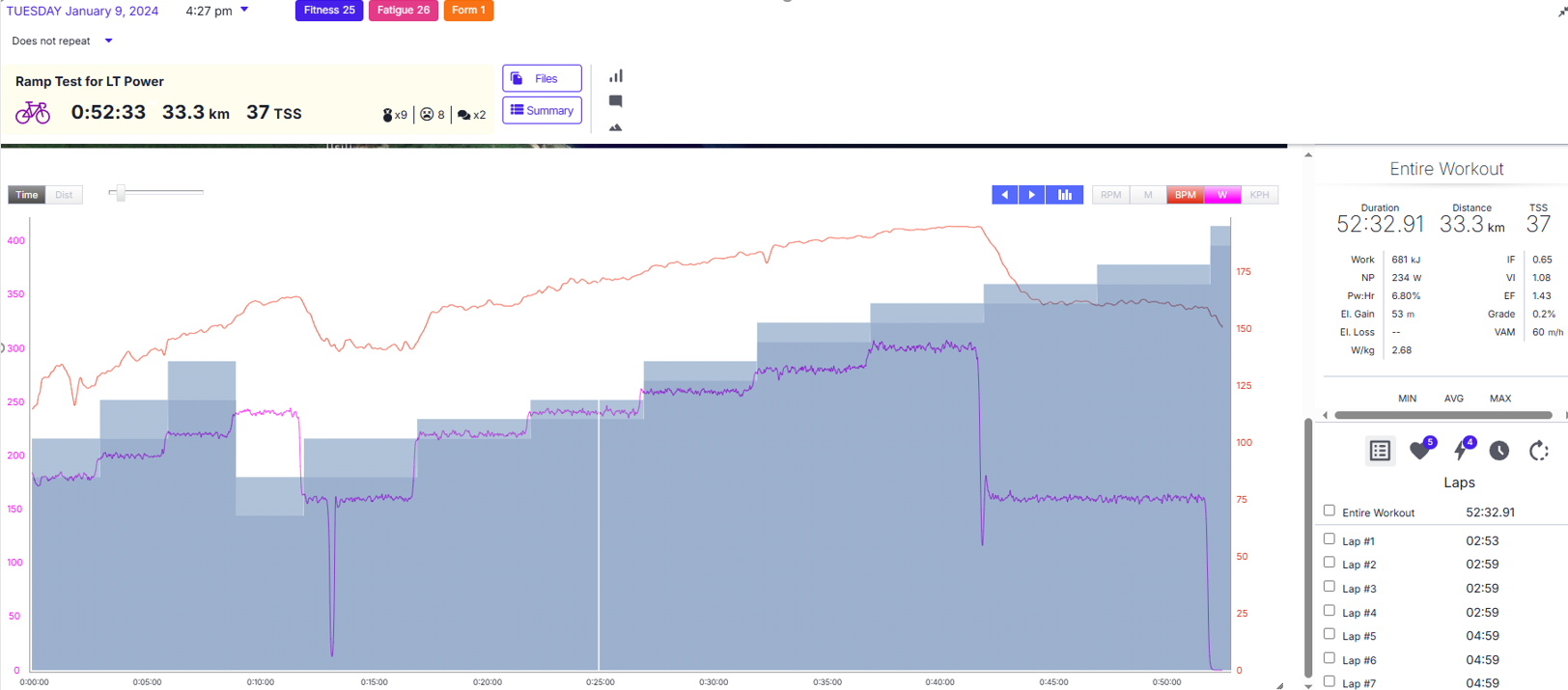 Rückblickend war das mein stärkster Ramp-Test überhaupt – und ich trainiere seit über 15 Jahren. Dabei konnte ich mit nur 73,6 kg Körpergewicht sogar fast die halbe 420 W Stufen fahren und das bei 5 min Stufendauer!
