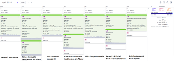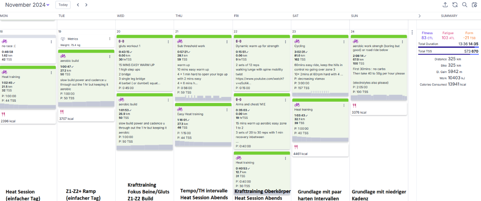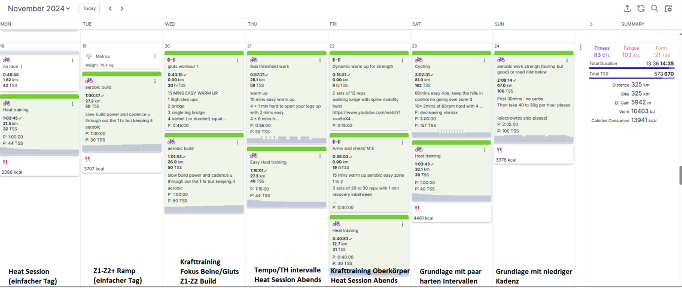 - Teilweise 2 Einheiten am Tag (Heat Training spät wenn Kinder schlafen – Zeitpunkt dafür ist nicht ideal)