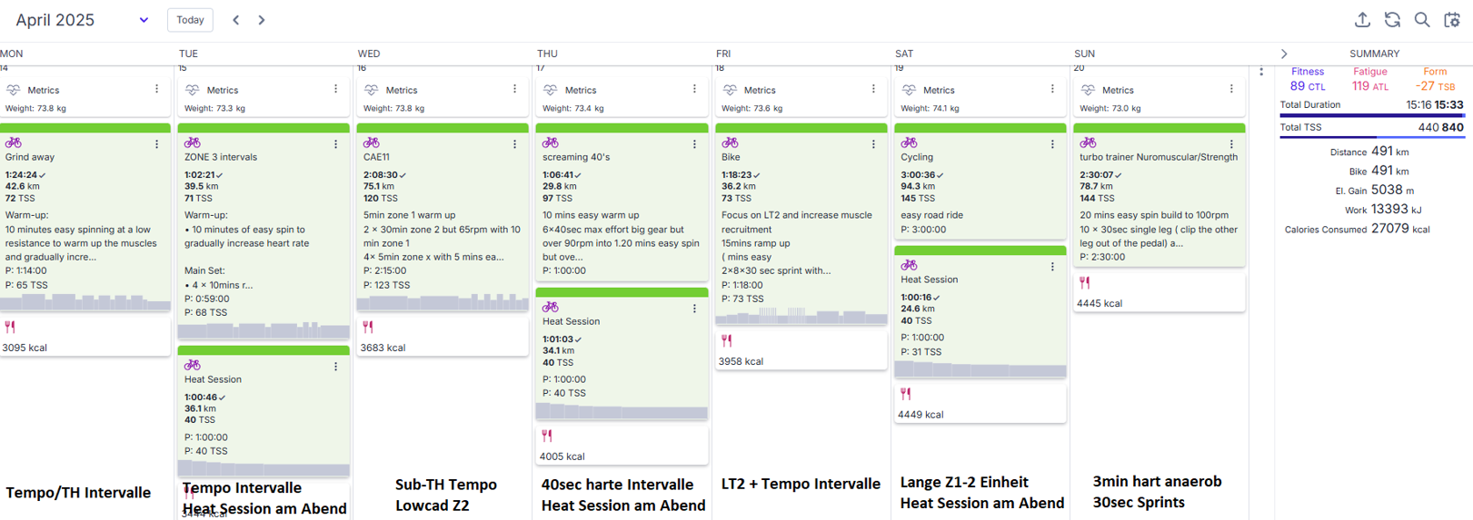 - Teilweise 2 Einheiten am Tag (Heat Training spät wenn Kinder schlafen – Zeitpunkt dafür ist nicht ideal)