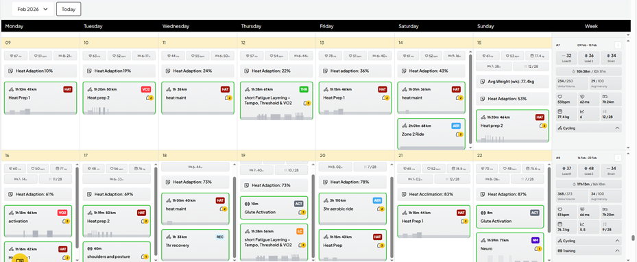 Ab Mitte Januar war meine Gesundheit wieder stabil. Anfang Februar startete ich schließlich mit einem zweiwöchigen Hitzetrainingsblock:
