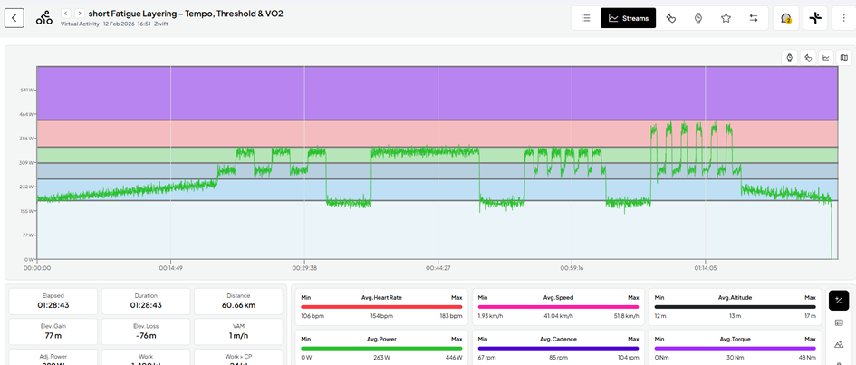 Beispiel: mein wöchentliches „Fatigue Layering“-Workout, bestehend aus Schwellenintervallen (Grün), VO₂max-Intervallen (rot), Tempo (Dunkelblau):